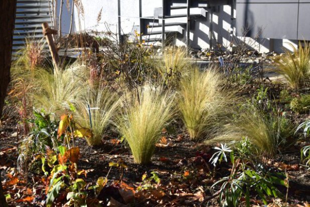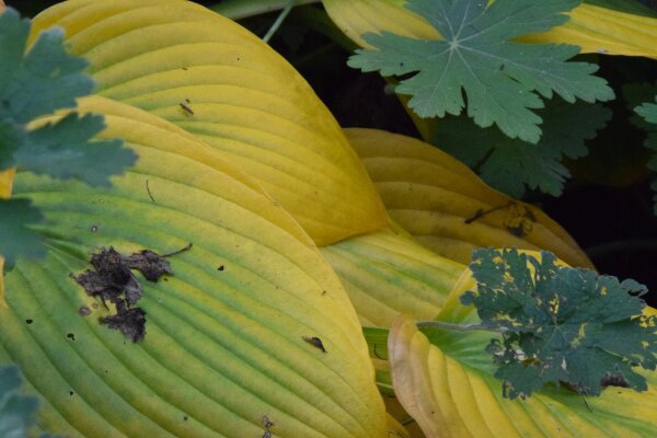 Laub zwichen Stauden und Gräsern als Winterschutz